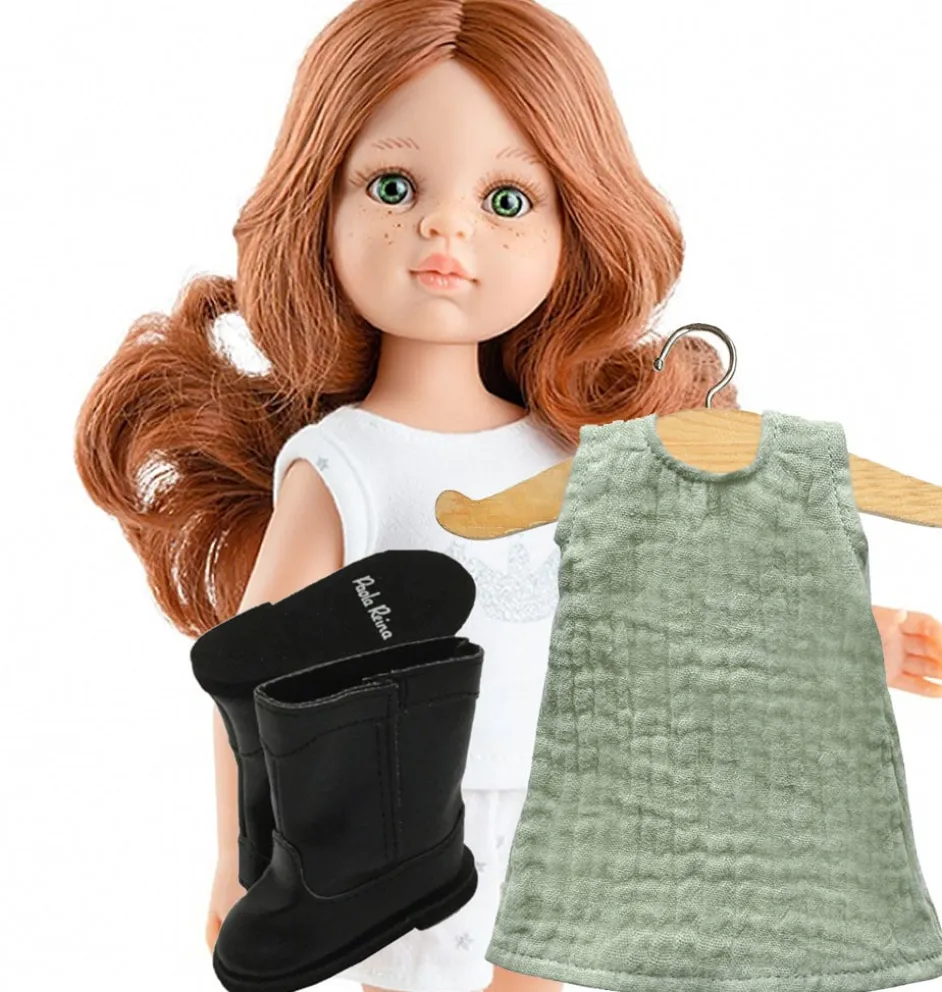 Die Puppe wird in einem weißen Pyjama geliefert, der aus einem Ober- und Unterteil sowie einem Stirnband besteht. Die Kleidung auf dem Foto ist nicht im Preis inbegriffen