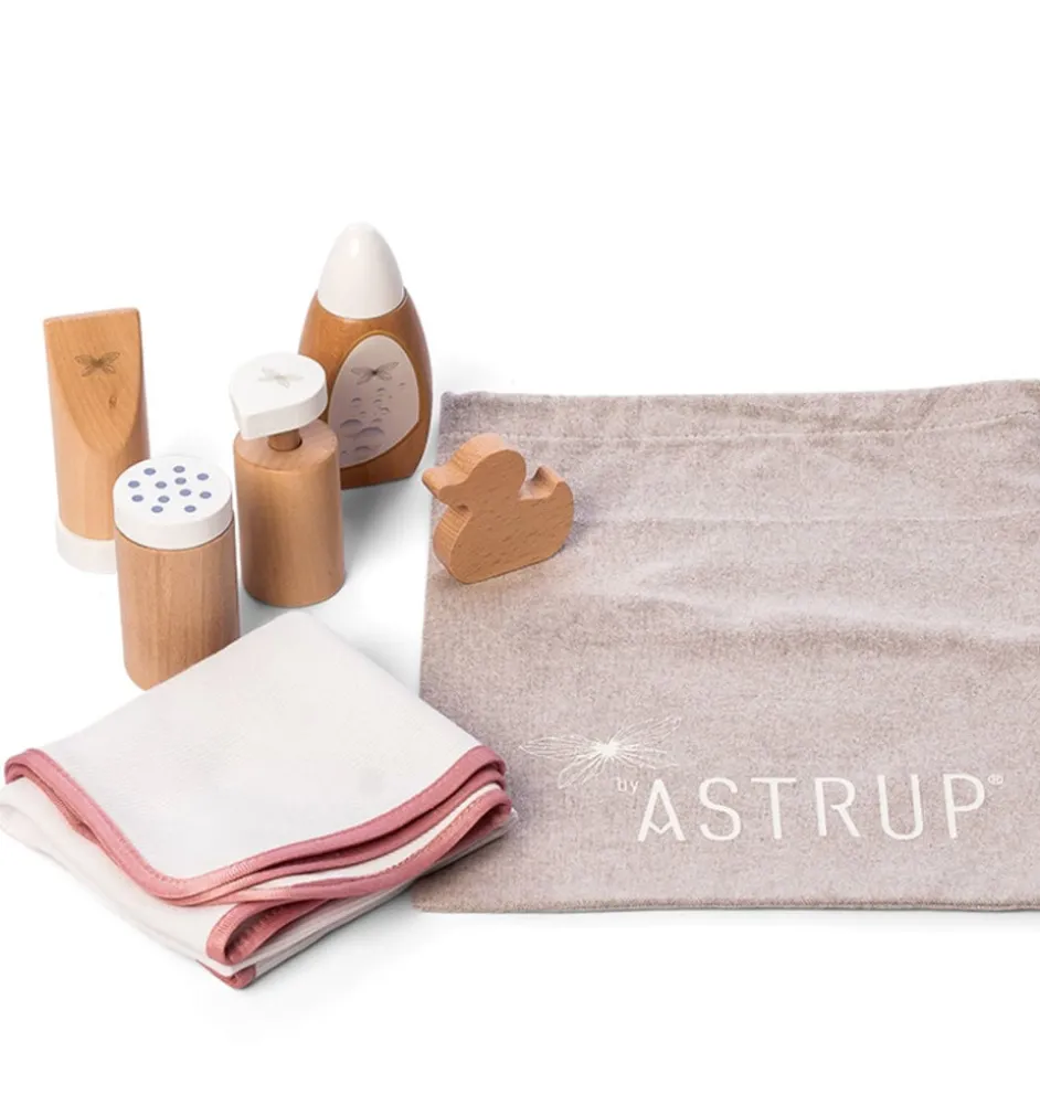 Das 7-teilige Puppenpflegeset aus Holz der dänischen Marke By Astrup. Das Set enthält eine Badeente, einen Pulverbehälter, eine Shampooflasche, einen Seifenspender, eine Tube Lotion, ein Handtuch und eine Aufbewahrungstasche. Alles ist aus hochwertigem Sperrholz und Baumwolle gefertigt. Auch im Kinderzimmer sieht das Set sehr schön aus. Das macht nicht nur Spaß beim Spielen, sondern ist auch ein absolutes Must-Have für alle Puppenmütter.