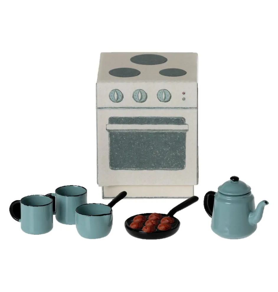 Ein Miniatur-Kochset mit allen Favoriten von Madam Blue. Eine Dose und zwei Tassen, ein Topf und eine Pfanne mit köstlichen Profiteroles, einer traditionellen skandinavischen Delikatesse im Winter. Alle diese Teile sind in einem Karton verpackt, der wie ein Herd aussieht.