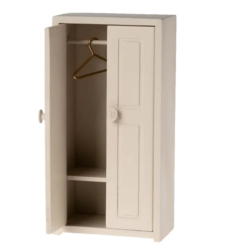 Ein Holzschrank von Maileg. Speziell für die Mäusefamilie entworfen (inklusive 3 goldenen Kleiderbügeln).