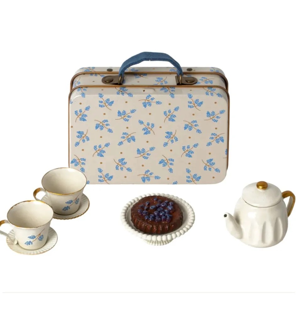 Dieser Metallkoffer von Maileg ist supersüß, mit Teetassen, einer Teekanne und einem leckeren Blaubeerkuchen.