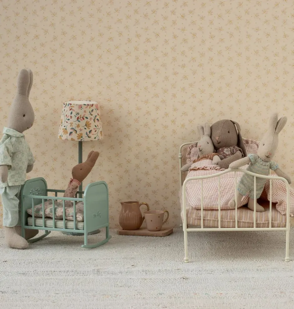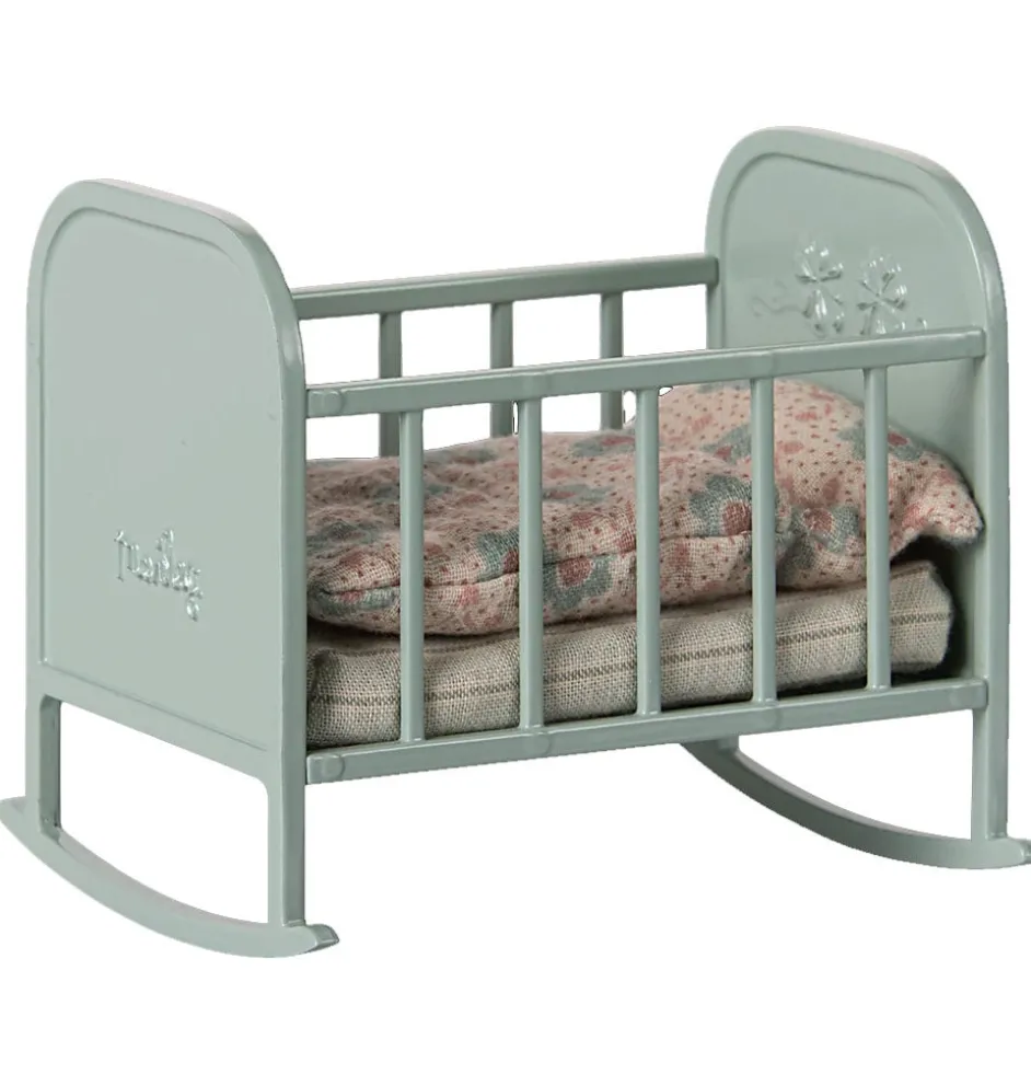 Die Wiege ist aus Metall und hat im Inneren einen Schlafsack und eine Matratze. Das Kopfteil hat ein Blumenrelief und das Maileg-Logo.