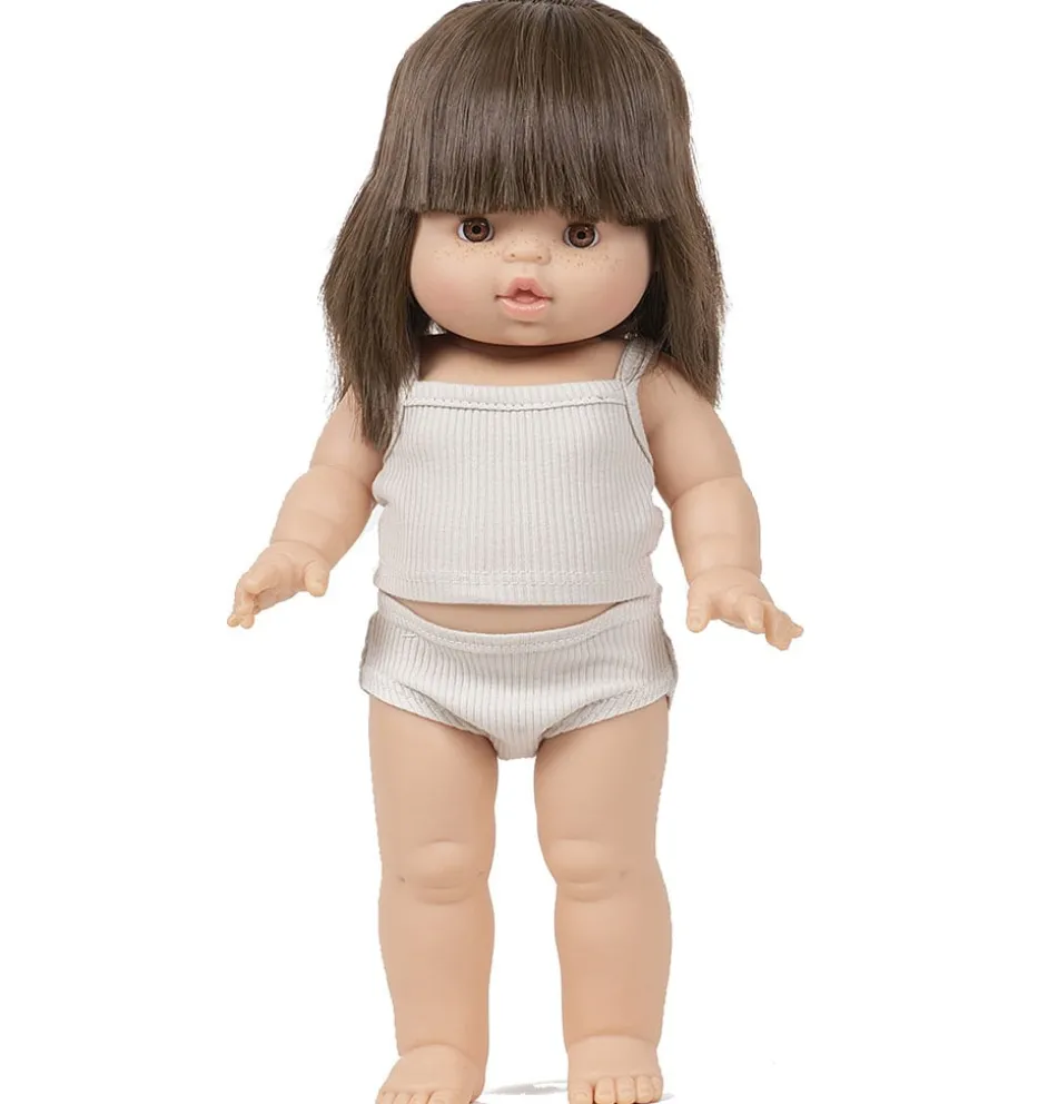 Minikane / Paola Reina Puppe Janelle37 cm. Diese Puppe kann aufrecht stehen, hat gerade Beine und ist 37 cm groß. Sie trägt ein Minikane-Unterwäscheset. Die Puppe kann aufrecht stehen und ist etwas größer als die Gordi-Puppen. Wie alle Gordi-Puppen duftet sie leicht nach Vanille. Die Puppe ist in einer Minikane-Verpackungsbox verpackt.