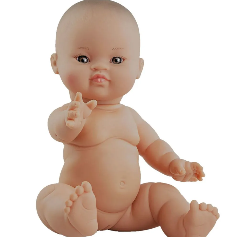 Paola Reina Gordi Mädchen Babypuppe asiatisch mit Augenbrauen und dunklen Augen.